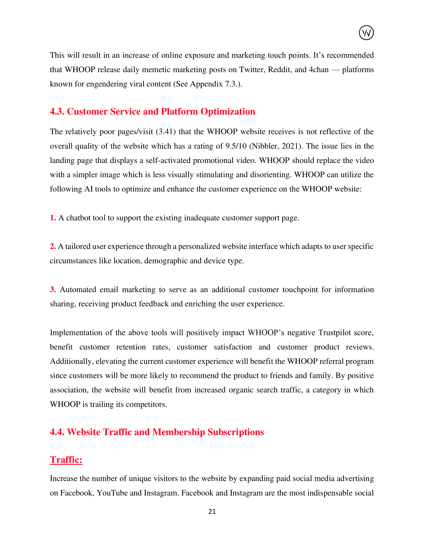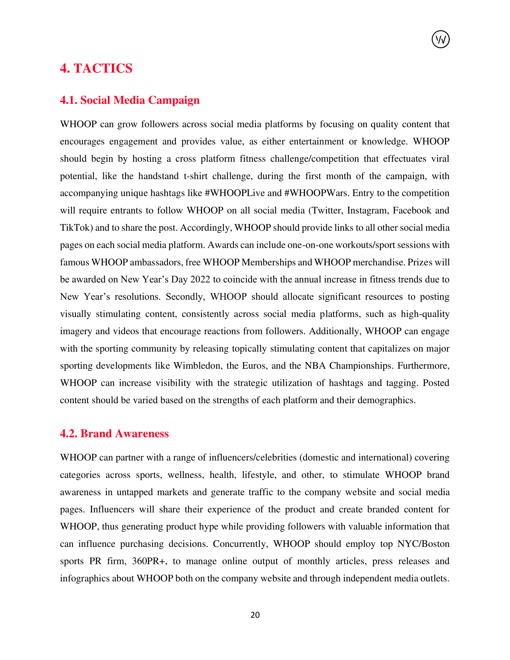 This digital marketing plan for WHOOP details a bold strategy to elevate the brand in the competitive fitness wearables market. By targeting health-conscious, performance-driven individuals, WHOOP aims to grow its social media presence, improve customer engagement, and boost membership subscriptions. Tactics include influencer partnerships, viral social campaigns, and platform optimizations like AI chatbots and personalized experiences. With a focus on delivering actionable insights and unlocking human potential, this plan positions WHOOP to expand its global reach, refine its premium value proposition, and solidify its reputation as the go-to wearable for high-performance living.